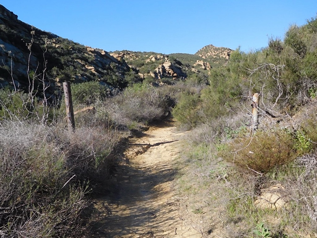 Four hikers met at 6:30 AM at the starting point of our hike on Poema Place in Chatsworth on a summer morning. We began our hike by descending into the heavily shaded bottom of Devil Canyon where we followed the remnants of the Devil Canyon Motorway upstream as it frequently crisscrossed the dry streambed. We zigzagged our way down the trail until eventually we reached the large check dam at the junction with the mouth of Ybarra Canyon (which extends north to the Regional Park at Joughin Ranch). This first part of our hike led through a mostly heavily shaded environment bordered with interesting rock formations, and quite a bit of poison oak.