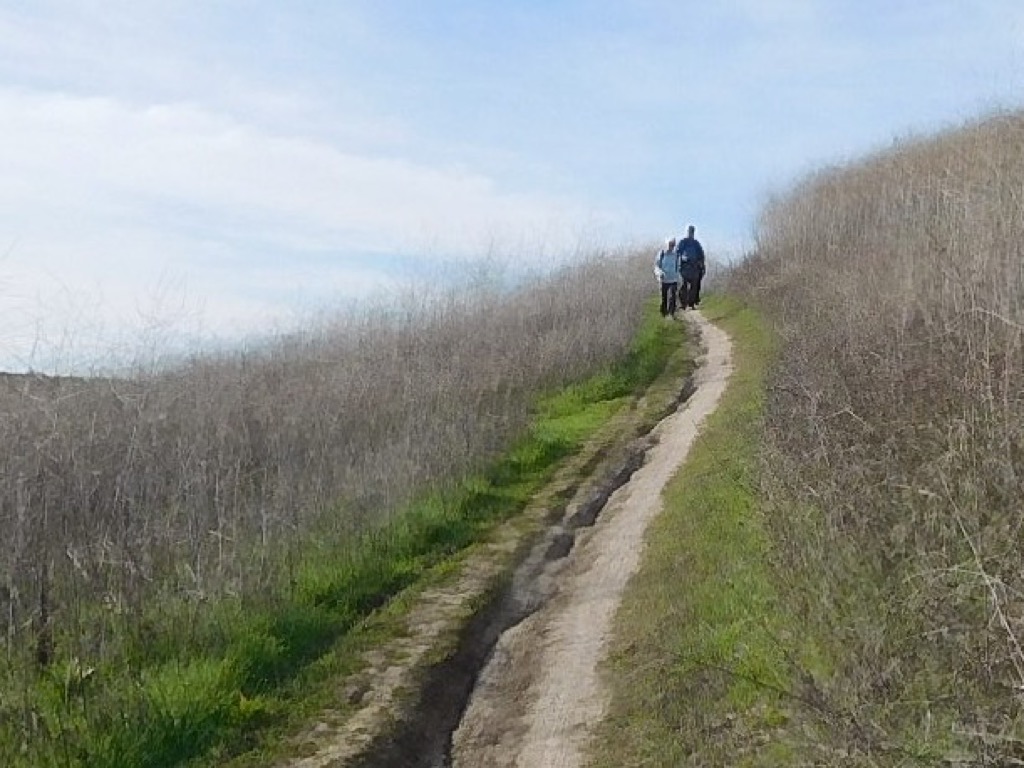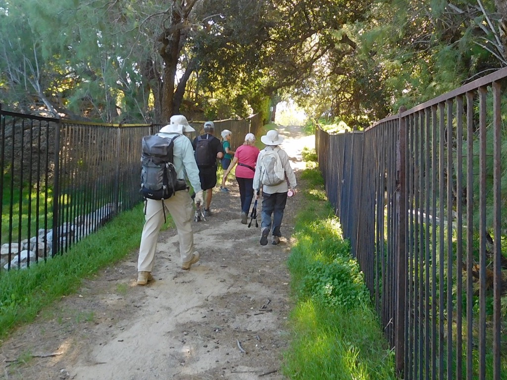 Nine hikers met at 7:30 AM at the North Ridge Trail trailhead on Flanagan Dr. and Yosemite Ave. on a pleasant overcast morning. Our hike began as a narrow path, surrounded on both sides with a mixture of lush green grass, lupine and mustard. Continuing past Broken Arrow Street trailhead on the North Ridge trail until we reached Evening Sky Dr. There we walked to the end of the Dr. where there was a gate that opened to a trail that led through Chumash Park. Heading east the trail turned into an old dirt road that ran along the east side of Mount Sinai Cemetery. When the road leveled out we turned left (northeast) onto the remains of a dirt road leading into what was once Douglas White Oaks Park , but is now “A few crumbling stone foundations dotting a small canyon in northeastern Simi Valley,” all that’s left of what was once a 355-acre ranch property used by Douglas Aircraft Company as a recreation area for its employees. Coming back to the dirt road, we went southward to a point where we could turn right and head northwest alongside Mt. Sinai Drive to an unmarked trailhead a short distance west of the main entrance to the Mt. Sinai Cemetery. That trail led us northwest uphill to the Flanagan Rocks area. We crossed Flanagan Drive and walked down the sidewalk back to our vehicles, thus completing a 4.7-mile hike with about 687’ of elevation gain/loss, on a pleasant morning for hiking.