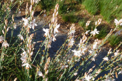 We then headed upstream into heavily shaded Wildwood Canyon. The trail crossed crystal clear flowing water several times on short wooden bridges. When we reached Hoegeman’s Hollow, there were several picnic tables (and bathrooms). We took a short break then continued upstream to Paradise Falls where we enjoyed looking at and listening to the waterfall. Continuing on up Wildwood Canyon we eventually reached the always pleasant Indian Creek Trail and followed it up to a short unnamed trail that led us back to our vehicles, thus completing a very pleasant 4.8-mile hike with about 850’ of elevation gain/loss. Flowering plants photographed were; Heart Leaved Penstemon, watercress, yerba mansa, bladderpod, chalk dudleya (live-forever) and castor bean.