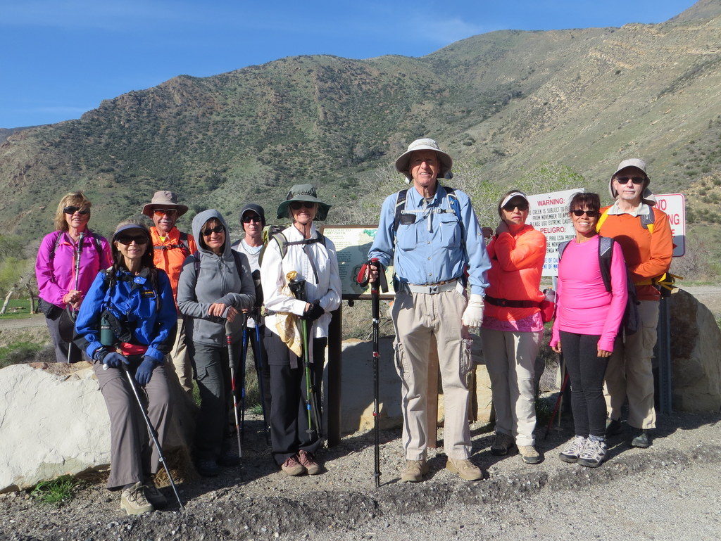 13 hikers met at the Horn Canyon trailhead adjacent to the Thacher School a few miles east of downtown Ojai on a nice spring morning. As our hike began, the trail rose gradually upward to the north along a dirt road flanked by wildflowers. The route soon became a shady trail that followed a pleasant creek (with water in it!) as it continued up toward the Nordhoff Ridge; there was an amazing array of lovely wildflowers adorning the path. After several easy stream crossings, the trail began to rise inexorably via switchbacks toward our destination and we were rewarded with great views of the Ojai Valley and onward to the ocean and Santa Cruz Island plus a view of a slice of Lake Casitas – and more beautiful wildflowers! Eventually we reached the Pines Trail Camp which provided cool breezes and some shade although most of the pine trees have been cut down or are dead but still standing [camping is no longer permitted in this campground]. After resting and eating lunch we returned the way we came, again admiring the beauty of the trail. We reached our vehicles and returned home having completed a somewhat demanding 5.5-mile hike with 1,845′ of elevation gain/loss, planning to return again next year.