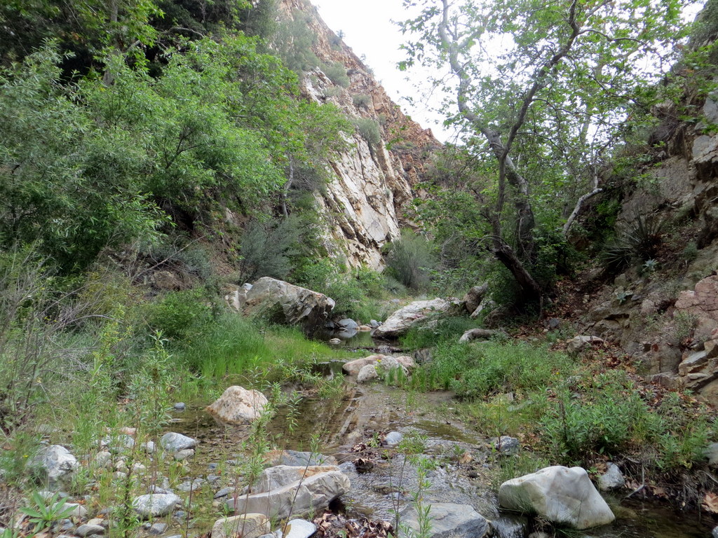 Despite forecasts of possible rain and thunderstorms, 15 hikers braved the elements for this unique hike. Fortunately the only rain we encountered fell as we were driving to the starting point of our hike at the gate at the east “end” of Templin Highway north of Castaic Lake. It was a cloudy day with pleasant temperatures during the entire hike. We began by descending northeast along the closed paved road to a concrete bridge at the mouth of Cienega Canyon [which is quite overgrown]. Passing by and continuing southward as the road turned to dirt we soon veered left (eastward) onto the abandoned easy-to-follow Warm Springs-Fish Canyon Truck Trail which passed through a narrow gorge and was bordered by a variety of beautiful blooming wildflowers; after several paved creek crossings we reached the abandoned Cienega Campground (nearly three miles from our starting point). We immediately left the Truck Trail and headed north along a lovely shaded single-track trail for about a mile to “Pianobox” [an old mining claim] where there’s a campsite. The single-track trail ended as we entered the Fish Canyon Narrows and we found ourselves rock hopping, pushing through brush, and crisscrossing the creek to follow stretches of “use” trail for the next mile or so. The stream was flowing and provided a musical accompaniment as we hiked carefully through the narrow canyon bordered by very scenic reddish hundred-foot rock walls and populated with oaks and alders. We eventually reached the Rogers Trail Camp in a small oak-shaded clearing on an oak- and sycamore-shaded bench. After we took a much-needed lunch-and-rest break we returned the way we came and returned home having completed an 11 mile hike with 1,000′ of elevation gain/loss, a hike described in 2009 by Los Angeles Magazine as the best hike in Los Angeles!