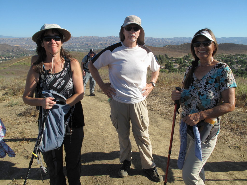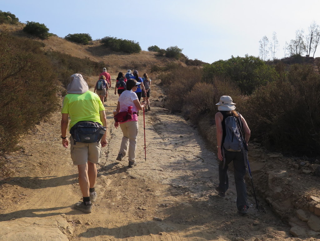 Our hike started with 25 people and one dog. One hiker turned back before the Canyon View Trailhead. The remaining group started up the very steep trail, and after arriving at the top of the ridgeline, enjoying great local views, despite the fact the distant views were obscured by smoke. After arriving at the intersection of Long Canyon Road and the Canyon View Trail, three hikers and the dog headed back to the trailhead, following Long Canyon Road east to Challenger Park. 21 hikers continued on 7/10 of a mile, up the steep Long Canyon Trail, to a trail junction that overlooks a good part of Simi Valley and Thousand Oaks. From there we took a “use” trail connector into Oak Canyon. At intersection of Montgomery Canyon and Oak Canyon, five additional hikers elected to continue on down the hill, and also head back to Challenger Park via Long Canyon Road. 16 hikers continued on up the next hill into Montgomery Canyon, heading to Challenger Park. As before, two more exhausted hikers decided not to tackle the final hill in the Challenger Park, and they too followed Long Canyon Road to the Challenger Park Entrance. 14 remaining intrepid hikers completed the entire 7.5 mile loop, overcoming almost 1,700’ of total elevation gain.