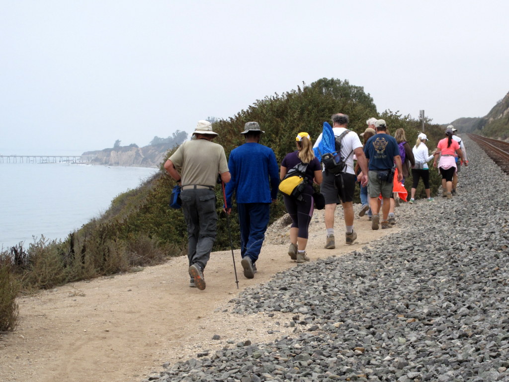 21 hikers met in the parking lot at Rincon Park a little south of Carpinteria on a cooler-than-normal late-summer morning. Our hike began along the Carpinteria Bluffs overlooking Bates Beach and the Pacific Ocean. The trail ran parallel to the railroad tracks for about a mile and a half and then led through a grove of eucalyptus trees over to the Carpinteria Harbor Seal Preserve which is home to almost 100 adult seals who give birth to their cubs on the Carpinteria shoreline; it’s one of the four harbor seal rookeries remaining along the southern California coast.