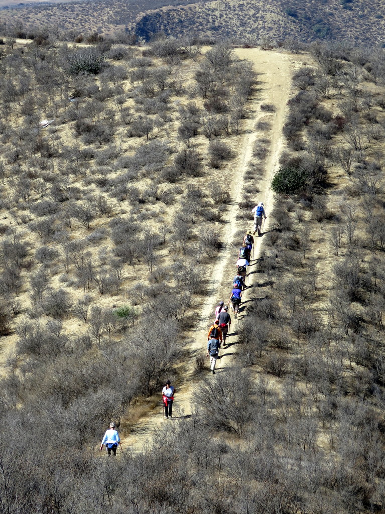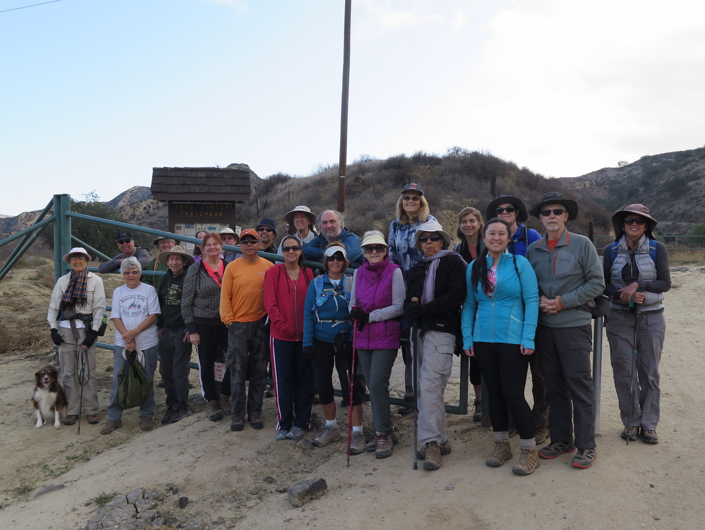 20 hikers met at the carpool point on a cool overcast morning. Since it was to be a one-way hike, we took eight vehicles to the hike’s end-point at the northwest end of Falling Star Avenue in Oak Park. After dropping off four vehicles there, we carpooled to the hike’s starting point in a dirt parking lot along Erbes Road. After the obligatory group photo was taken, we hiked up to a fine overlook of the Bard Reservoir in Simi Valley. As we then followed a trail eastward along the north side of the gated community in Sunset Hills there was enough very light rain to warrant donning rain jackets. Next we headed south into the Lang Ranch Open Space where we experienced a bit of route-finding confusion which was soon resolved as we followed the Autumn Ridge Trail to Lang Ranch Parkway where a neighborhood park provided a convenient rest stop. Our hike continued as we climbed steeply up the Oakbrook Vista Trail to a high peak which provided a 360-degree panoramic view of the surrounding areas. We then followed the Hidden Meadows Trail to Falling Star Avenue. We retrieved our other vehicles and returned home having completed a pleasant 7.5-mile hike with 1,500′ of elevation gain on a cool crisp winter morning.